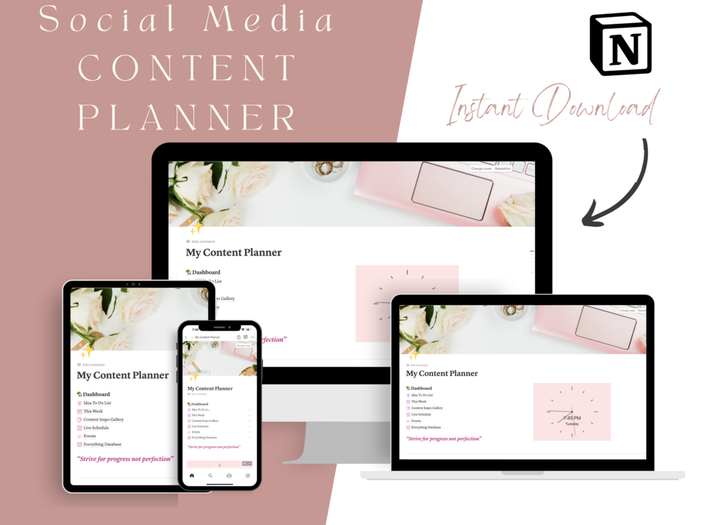 This is the ultimate Social Media Content Planner that is easy to use and will help maximize your productivity & streamline your workflow! You can customize it to fit your personal brand/aesthetic. Some of the features included in the template: